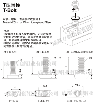 T型螺栓直接放入型材槽內,安裝過程中它能自動定位鎖緊,常與法蘭螺母配合使用,是安裝角件等常用型材配件。根據不同型材、槽寬及安裝要求可選用不同規格及長度的T型螺栓。